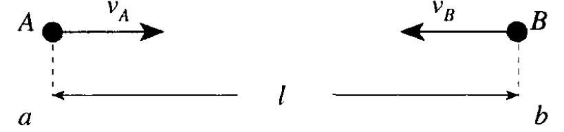 frame, the Earth observer determines that rocket A, travelling to the right at vA = 0.8c, is at point a, and rocket B is at point b, travelling to the left at vB = 0.6c. They are separated by a distance l = 4.2 ×108 m (see Figure 1.1b).