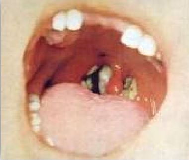 اعراض داء الخناق "تغير لون الغشاء إلى اللون الرمادي" Diphtheria pseudomembrane