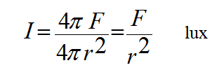 فاذا تصورنا كرة جوفاء مركزها المصدر و نصف قطرها r فان شدة الاستضاءة عند أي نقطة على سطح الكرة تعطى من