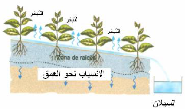 * السيلان أو الانسياب فوق سطح الأرض، أي أن ماء المطر أو ماء الري لا تمتصه التربة في كثير من الحالات، بل نجد أن جزءا كبيرا أو صغيرا ينساب فوقها بدون أن يتسرب إلى طبقة الجذور، كما يمكن أن يحدث هذا أيضا بعد ما تمتص التربة ما يكفيها.