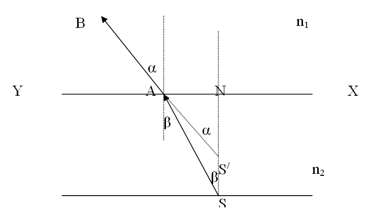 نفرض أن S نقطة مضيئة موجودة في وسط شفاف معامل انكساره n2 ،فان SA يمثل شعاع ساقط من هذه النقطة على السطح المستوى XY الذي يفصل بين هذا الوسط و وسط آخر شفاف معامل انكساره n1 و أقل كثافة ضوئية من الوسط السابق، و أن AB يمثل اتجاه الشعاع المنكسر في هذا الوسط كما بالشكل.