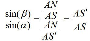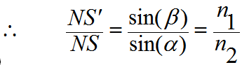 نفرض كذلك أن SN هو اتجاه شعاع خارج من النقطة S في الاتجاه العمودي على السطح XY ، هذا الشعاع ينفذ إلى الوسط الثاني دون أن يعانى أي انكسار. فإذا مد الشعاع BA ليقابل SN فيS/ فان:
