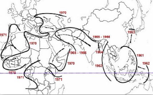 خريطة جغرافية توضح جائحات الكوليرا خلال الفترة ما بين سنة 1961 – 1971 .