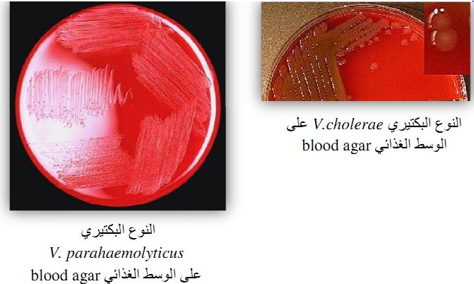 ــ الوسط الغذائي Blood agar : المستعمرات النامية للنوع البكتيري V. cholerae لها القدرة على الإحلال الكامل لكريات الدم الحمراء (B-haemolysis).