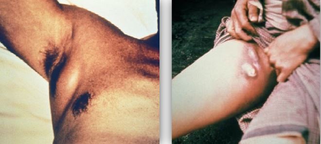 وهو أكثر الأشكال انتشاراً ويتصف بحمى شديدة والتهاب للقعد اليمفاوية acute lumphadenitis مع ظهور انتفاخ مدمي مصحوب بألم ويسمى buboes وغالباً ما يتكون في منطقة أصل الفخذ groin agea ، كما أنه في الغالب ظهور هذا الانتفاخ في منطقة الرقبة أو الإبط وهذا يعتمد على مكان لسعة الحشرة ويصاحب ذلك زيادة عدد كريات الدم البيضاء وبالأخص العدلات neutrophilia .