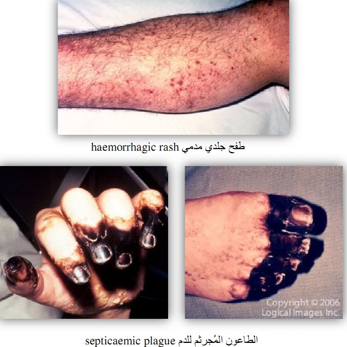 ــ الطاعون المجرثم للدم septicaemic plague : وهو من اخطر الأشكال حيث تتواجد أعداد كبيرة من النوع البكتيري Y. pestit في الدم ويمكن الكشف عن البكتيريا الممرضة في عينة الدم الطرفية مع عدم تكون buboes في أغلب الحالات المصابة مع ظهور طفح جلدي مدمي haemorrhagic rash وهو مميت بصورة سريعة.