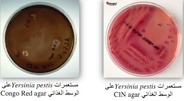 ــ الوسط الغذائي CIN agar (الذي يتكون من المضاد الحيوي cefsulodin و Irganan والمضاد الحيوي novobiocin) والوسط الغذائي congo red agar : وهي أوساط غذائية انتقائية لهذا النوع البكتيري ، وإذا ما كان الغرض من استعمالهم لاختبار (Farction 1) capsulae antigen فلابد من تحضين العينة في درجة حرارة 37 درجة مئوية لتهيئة الظروف لتكوين مستضد الحافظة.