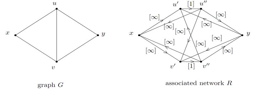 Proof. Let us build a network from graph G in the following way: each edge of G is first replaced by two opposite arcs, giving a digraph, denoted by G/, which has the same set of vertices as G. Then, each vertex z ≠x, y of G/is split into two vertices z/and z//with an arc (z/,z//) of capacity 1. Any arc entering into z is replaced by an arc entering into z/with a capacity ∞.Any arc exiting from z is replaced by an arc exiting from z//, also with a capacity ∞. Vertices x and y respectively play the role of source and sink in the network thus defined, which we denote by R (see an example in Figure 1.1).