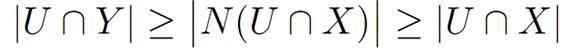 Let there be U ⊆ X ∪ Y (note that the set of the vertices of the graph here is X ∪ Y , and not simply X as in Gale’s theorem). If we don’t have N(U ∩ X) ⊆ U ∩ Y ,then ω−(U) ≠ ∅, c(ω−(U)) = ∞, and Gale’s condition is trivially verified. If N(U ∩ X) ⊆ U ∩ Y ,we have ω−(U)= ∅,and so c(ω−(U)) = 0, and Gale’s condition can be written: