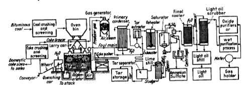 ينساب الناتج الثانوي في الخط الهيدرولي الرئيسي أولا بواسطة الخط الرئيسي الملوث عبر مكثف أولي ومستخلص معترض للقطران ، كما بينت الصورة ادناه حيث يفصك غاز فرن الكوك من سائل الأمونيا وقطران الفحم . وتزال الأمونيا من الغاز على شكل سلفات أمونيوم عن طريق البقبقة ( القرقرة ) Bubbling خلال حمض الكبريت .