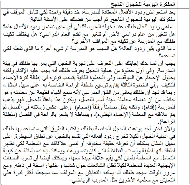 ويظهر معظم الأطفال القليل من تلك الأعراض على الأقل في بداية العام الدراسي، حيث تشير تلك الأعراض الى شعور الطفل بالإثارة الإيجابية إزاء توسيع منطقة الراحة. ولكن إذا استمرت تلك الأعراض في الظهور لدى طفلك بدرجة حادة أو إذا كانت صفات ليست متعلقة أبداً بشخصية طفلك ولا بكيفية تكيفه عادة لما هو خارج منطقة الراحة الخاصة به، فقد يشير ذلك الى أنه يعاني من مشاكل خطيرة إزاء الانتقال للعام الدراسي الجديد والارتياح للروتين الجديد. وإذا كانت تلك هي الحالة فسوف يحتاج طفلك للمزيد من المساندة والعطاء منك. وفي خلال هذا الفصل سوف أبين لك كيف تساعد طفلك على التأقلم مع المدرسة.