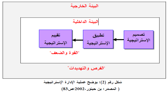 وقد لخص(ياسين) الإدارة الإستراتيجية بأنها عملية إبداعية عقلانية التحليل، وحدسية التصور الإنساني، وهي أيضا عملية ديناميكية متواصلة تسعى إلى تحقيق رسالة المنظمة من خلال إدارة وتوجيه موارد المنظمة المتاحة بطريقة كفوءة وفعالة، والقدرة على مواجهة تحديات بيئة الأعمال المتغيرة من تهديدات وفرص ومنافسة ومخاطر أخرى مختلفة وبغية تحقيق مستقبل أفضل انطلاقا من نقطة ارتكاز أساسية في الحاضر.(ياسين، 2010 :ص 20).