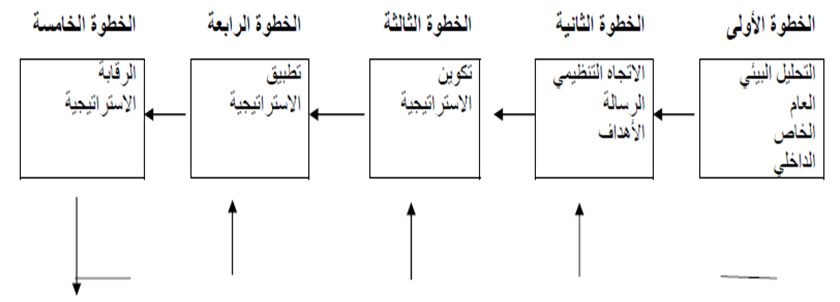 يقصد بالإدارة الاستراتيجية العملية الخاصة بالتأكيد من استفادة المنظمة من تطبيق الاستراتيجية التنظيمية المناسبة .وهذا يوضح بداية وقبل كل شيء ان الاستراتيجية المناسبة هي تلك الاستراتيجية التي تتناسب مع الاهداف التنظيمية في الوقت المعين وبصفة عامة تتكون الادارة الاستراتيجية من خمس مراحل متتابعة كما يلي: