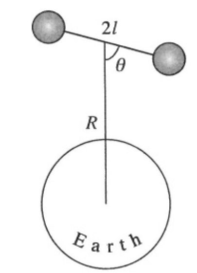Automatic stabilization of the orientation of orbiting satellites utilizes the torque from the Earth’s gravitational pull on a non-spherical satellite in a circular orbit of radius R. Consider a dumbbell-shaped satellite consisting of two point masses of mass m connected by a massless rod of length 2L, much less than R where the rod lies in the plane of the orbit (see Figure 1.1). The orientation of the satellite relative to the direction toward the Earth is measured by angle θ.