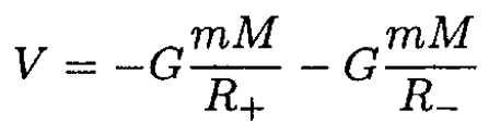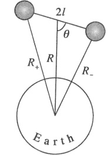 where M is the mass of the Earth, and R+ and R- are the distances from the center of the Earth to the two masses (see Figure 1.2). Using the formula