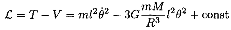 The angular velocity ω0 of the satellite about the Earth may be obtained from the equation for a circular orbit: mω20R = G(mM/R2). From the Lagrangian, we arrive at the angular velocity Ω of small angle oscillations of the satellite, where Ω2 = 3G(M/R3) = 3ω20 and so