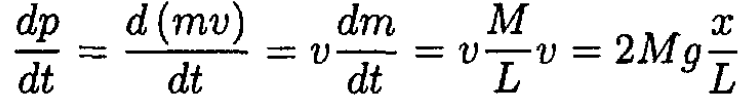 The reading of the scale consists of two parts: the weight of the chain accumulated and the impulse per unit time imparted by the chain colliding with the scale. The first part is clearly W1 = Mgx/L. The velocity of the links at the instant of hitting the scale is found from v2 = 2gx. The second component of the force exerted on the scale equals
