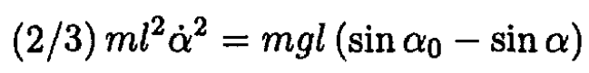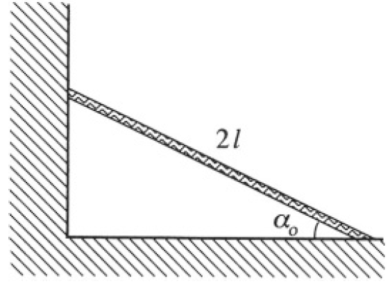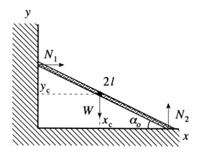 A ladder of mass m and length 2l stands against a frictionless wall with its feet on a frictionless floor. If it is let go with initial angle α0, what will be the angle when the ladder loses contact with the wall (see Figure 1.1)?