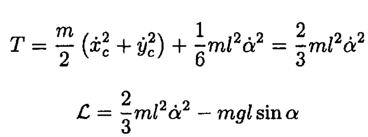 Let us watch the ladder until it leaves the wall. Forces N1 and N2 are normal reactions of the wall and floor, respectively; W = mg is the weight of the ladder; xc and yc are the coordinates of the center of mass (see Figure.1.2). First, find the Lagrangian of the system. The kinetic energy