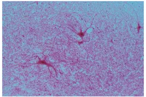 Anterior horn motor cells—i.e., motor neurons of the columnar anterior from the spinal cord— were obtained by careful maceration of the spinal cord and stained as a “squeeze preparation” (tissue spread out by gentle pressure). This technique makes it possible to preserve long stretches of the numerous long neuritis and make them visible after staining. In a tissue section, most of the cell processes would be sheared off. In this preparation, it is hardly possible to distinguish between axons (neuritis, axis cylinder) and the heavily branched dendrites. Axons extend from the nerve cell to the musculature and form synapses.