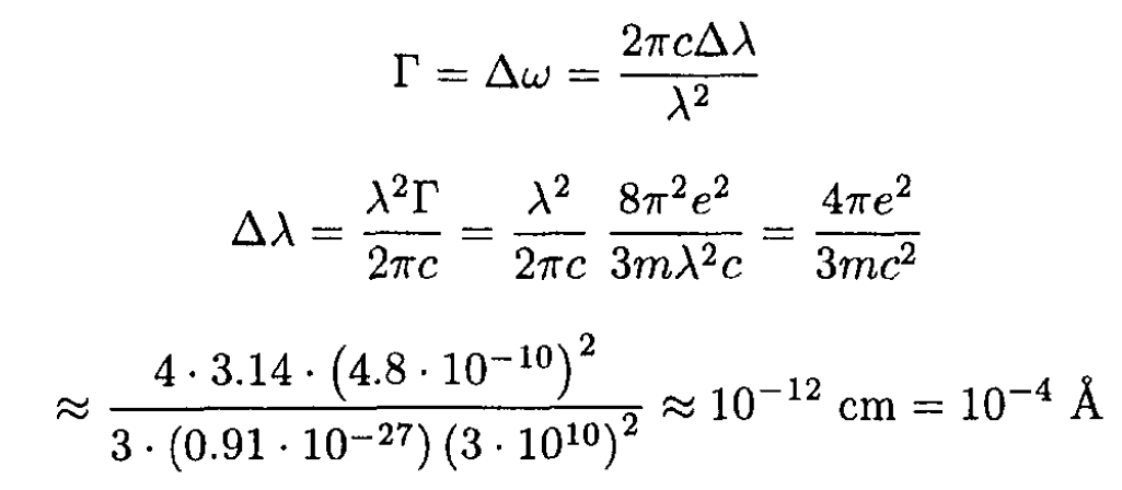 c) For an atomic spectral line of 5000 Å, what is the width of the spectral line, in angstroms, as determined from the calculation of (b)? About how many oscillations does the electron make while losing half its energy? Rough estimates are enough.