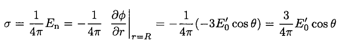 where θ is the angle between r and E', or, in this case, between r and ẑ (the origin of the spherical coordinates is at the center of the sphere). The surface charge density a is given by