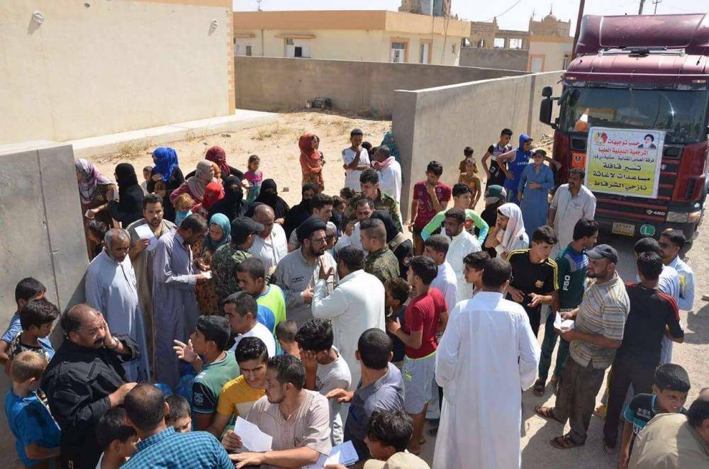 وأشار البيان: "فرق الإغاثة لاحظت الحالة المزرية للعوائل بسبب ما تعانيه من الجوع والعطش، وبالخصوص الرضّع، حيث قامت فرق الإغاثة بتجهيزهم بحليب الأطفال مع قناني الرضاعة، ووزّعت سلّات غذائية تحوي علب العصائر والحلويات، وقدّمت مياه الشرب المعقّمة مع الثلج، حيث تمّ إلحاق ذلك بـ(2,000) قالب ثلج تمّ توزيعها على كلّ المناطق التي يتواجد فيها النازحون، كما قامت فرق الإغاثة بتوزيع ملابس وأحذية وبطانيات لتلك العوائل". مؤكّداً أنّ: "تلك الخطوة رسمت الابتسامة من جديد على الشفاه الذابلة للشيوخ والأطفال والنساء الذين أرهبهم إجرام عصابات داعش التكفيرية".