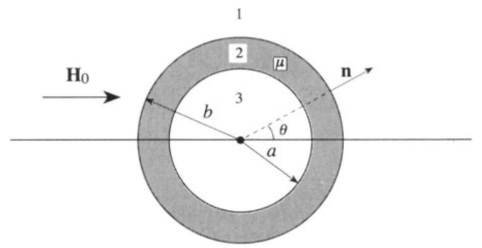 the constitutive relation B = μH; and n is a unit vector parallel to r. From (1)–(3), we can impose conditions for the normal components of B and the tangential components of H, taken at the same angle θ