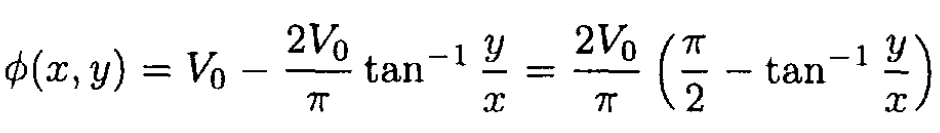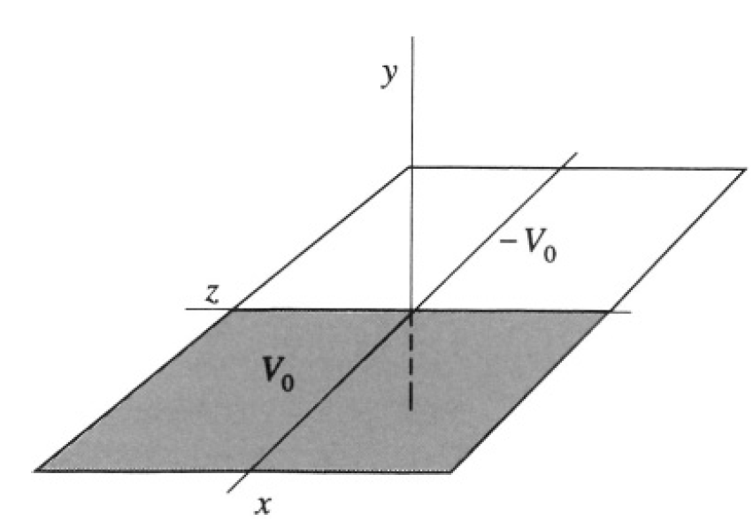 An infinite conducting plane (the x-z plane in Figure 1.1) is divided by the line z = 0. For x > 0, the potential in the plane is +V0, while for x < 0. the potential is –V0. Evaluate the potential everywhere.