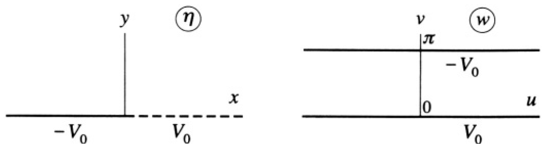 This problem is symmetric for displacements along the z-axis, so we can consider this a two-dimensional problem in the x – y plane, a candidate for the method of conformal mapping. It can be seen that the function ω = ln η (η = x +iy, ω = u + iv) transforms the initial plane so that points at y = 0 for map into the line v = 0, and the points at y = 0 for x < 0 map into the line v = π (see Figure 1.2). In the plane