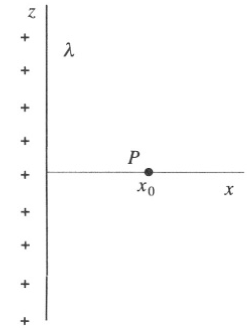 An infinitely long insulating filament with linear charge density λ lies at rest along the z-axis (see Figure 1.1).