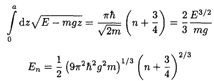 The potential energy here is U = mgz. We can apply the quasi-classical (WKB) approximation between points [0, a], where a = E/mg, with the quasi-classical function applicable all the way to z = 0. The wave function is given by