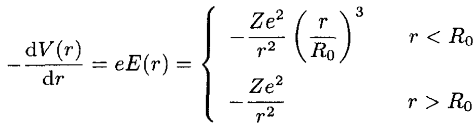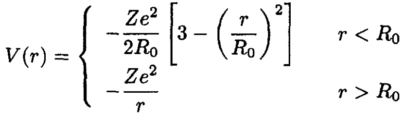 a) To find the potential V(r) near the nucleus, we note Gauss’s law, which states that for an electron at a distance r from the center of a spherical charge distribution, the electric field is provided only by those electrons inside a sphere of radius r. For r < R0, this is the charge Z(r/R0)3, whereas for r > R0 it is just the charge Z . Thus, we find for the derivative of the potential energy: