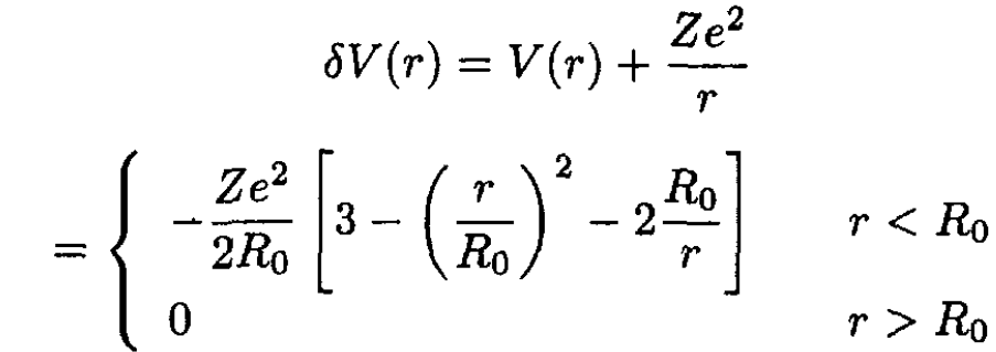 a) Derive an expression for the electrostatic potential V(r) between the nucleus and the electrons in the atom. If V0(r) = -Ze2/r is the potential from a point charge, find the difference δV = V(r) – V0(r) due to the size of the nucleus.