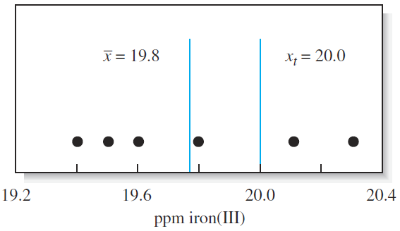 Figure 1-1 Results from six replicate determinations of iron in aqueous samples of a standard solution containing 20.0 ppm iron(III). The mean value of 19.78 has been rounded to 19.8 ppm