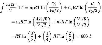 b) The energy of the ideal gas does not change in the isothermal process, so all the work done by the gas goes into heating the reservoir. Denoting by n1 and nr the number of moles on the left and right sides of the cylinder, respectively, and using nr = 1/4 mole, we obtain the total work and, hence, heat given by the integral
