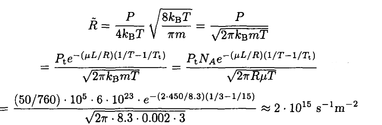 where ρ is the number density, 〈v〉 is the average speed, and η is a sticking coefficient, which for this estimate we take equal to 1. Where we calculated the rate of particles striking the surface. Now if the density is not too high, the number of particles leaving the surface does not depend on whether there is vapor outside, so this would be the sublimation rate. we get