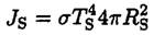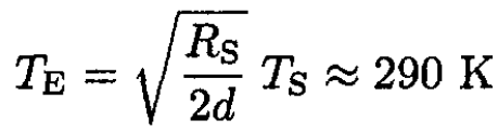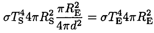 where σ is the Stefan–Boltzmann constant. Only a fraction π R2E/4πd2 of this flux reaches the Earth. In equilibrium this fraction equals the total flux radiated from the Earth at temperature TE. So