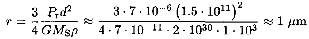 e) Let us estimate the radius of a particle for which the radiation force will equal the gravitational force at the distance of the Earth’s orbit d. Using (6), we have