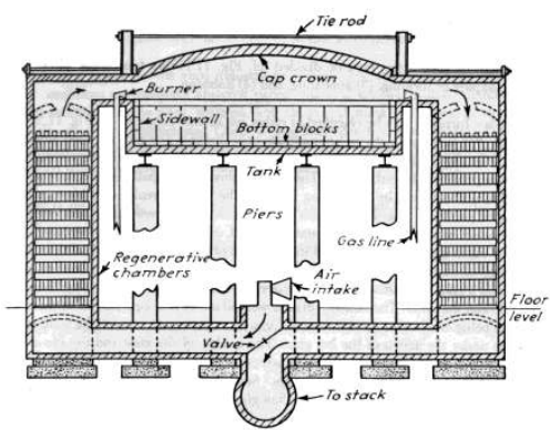 صورة 1-1 . مقطع عرضي في فرن صهريجي للزجاج يظهر حجرات الاسترجاع