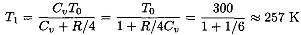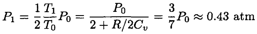 One part of a cylinder is filled with one mole of a monatomic ideal gas at a pressure of 1 atm and temperature of 300 K. A massless piston separates the gas from the other section of the cylinder which is evacuated but has a spring at equilibrium extension attached to it and to the opposite wall of the cylinder. The cylinder is thermally insulated from the rest of the world, and the piston is fixed to the cylinder initially and then released (see Figure 1.1). After reaching equilibrium, the volume occupied by the gas is double the original. Neglecting the thermal capacities of the cylinder, piston, and spring, find the temperature and pressure of the gas.