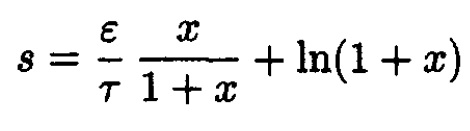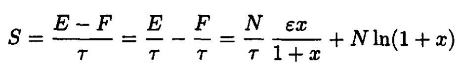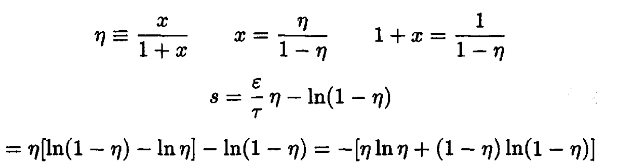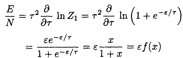 where x = e-ε/τ. Obviously, since both ε and τ are positive, x cannot be larger than 1. On the other hand, x/(1 + x) is a monotonic function which goes to 1/2 when τ goes to infinity; hence, max{E/Nε} = f(1) = 1/2 at τ → ∞.