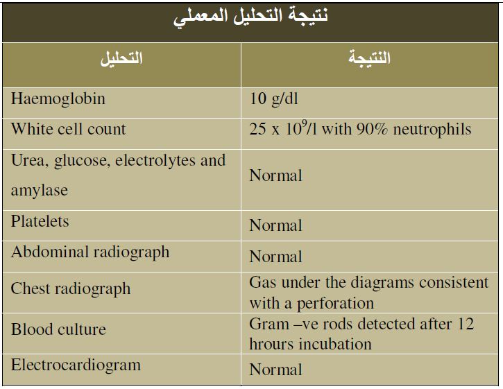 4- نتائج الاستقصاء كانت كما ي الجدول التالي، وتم علاج المريض بإعطائه المضاد الحيوي penicillin والمضاد الحيوي gentamicin وكذلك المضاد الحيوي metronidazole عن طريق الوريد. تم إجراء عملية طارئة لفتح البطن laparotomy حيث لوحظ وجود ثقب وتقرحات في الانثى عشر perforated duodenal ulcer والتهاب الصفاق . كيف ستتم التعامل مع هذه الحالة؟