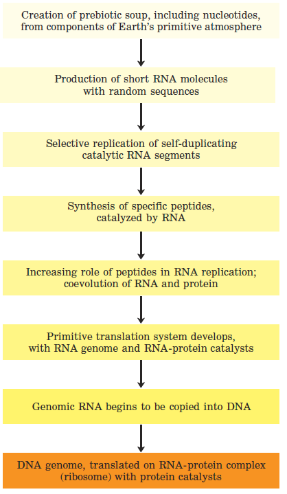 In modern organisms, nucleic acids encode the genetic information that specifies the structure of enzymes, and enzymes catalyze the replication and repair of nucleic acids. The mutual dependence of these two classes of biomolecules brings up the perplexing question: which came first, DNA or protein? The answer may be: neither. The discovery that RNA molecules can act as catalysts in their own formation suggests that RNA or a similar molecule may have been the first gene and the first catalyst. According to this scenario (Fig. 1–1), one of the earliest stages of biological evolution was the chance formation, in the primordial soup, of an RNA molecule that could catalyze the formation of other RNA molecules of the same sequence a self-replicating, self-perpetuating RNA.