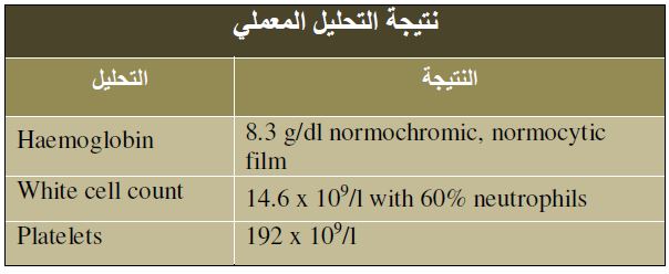 امرأة تبلغ من العمر ستون سنة حضرت للعيادة وهي تعاني من توعك وغثيان وفقدان الشهية. منذ عشر سنوات تم إيوائها المستشفى حيث كانت تعاني من خلل في الاورطة aortic root تم إصلاح هذا العيب بنجاح وذلك بإعادة الصمام الأورطي ومنذ ذلك الحين وهي تتمتع بصحة جيدة بالرغم من انها لم تبدأ في علاجها المانع للتجلط لقلة إمكانياتها المالية. بفحصها سريرياً تبين ان حرارتها بلغت 38 درجة مئوية ومتوردة ولا تبدو انها في صحة جيدة ومعدل النبض بلغت 110 درجة مئوية كما أن ضغط الدم بلغ 80/60 mm Hg وبفحص التسمع auscultation تبين وجود طقطقة في الصمام المرقع a prosthetic valvular click وهمس انقباضي a systolic murmur أما الصدر والبطن فهم في حالة سليمة. وكانت نتائج التحاليل كما في الجدول التالي.
