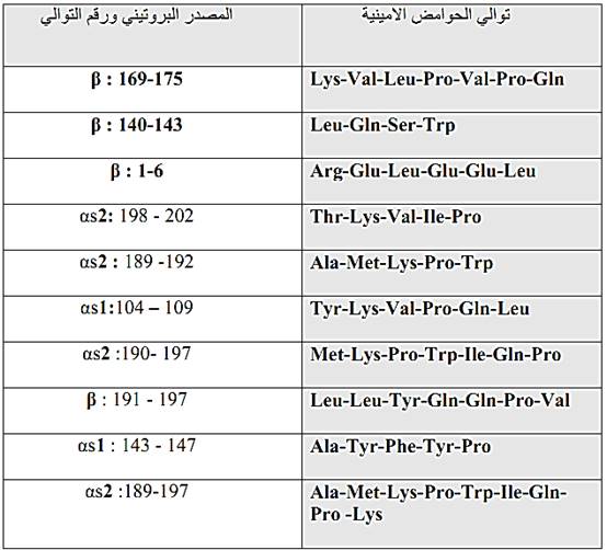 جدول 1 : البيبتيدات المخفضة لضغط الدم المنتجة من كازينات الحليب