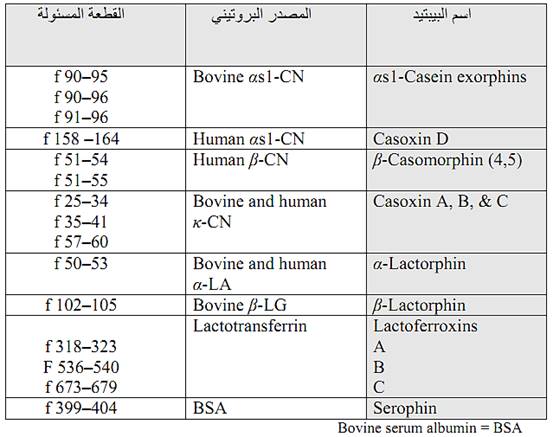 ويطلق على البيبتيدات المخدرة Opioid agonists وأهمها المشتقة من الكازين – بتا وتسمى المورفينات الكازينية β–casomorphins والاخرى مورفينات الكازين – الفا α – casomorphins وتوجد بيبتيدات اخرى منها α - lactorphins , β – lactorphins . وبالمقابل توجد بعض البيبتيدات التي تعاكس تأثيرها Opioid antagonist peptides والجدول (1) يوضح بعض هذه البيبتيدات.
