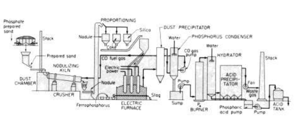 - تطحن الصخور الفوسفاتية وتصنف . - تمزج الصخور والرمل مع فحم الكوك ، وتلبّد ، ويجري إدخالها الى الفرن الكهربائي . - يسخن المزيج ويحول عند درجة حرارة مرتفعة . - يفرغ الخبث والفروفوسفور كل على حدة . - تسحب أبخرة الفوسفور و CO ، ويكثف الفوسفور . - ينقل الفوسفور في عربات صهريجية الى مراكز الاستلاك . - يصهر الفوسفور ويرذ في برج من الستانلس ستيل للأكسدة . - يتأكسد الفوسفور الى P2O5 . - يبرد P2O5 ويميه في جهاز أو برج إماهة من |