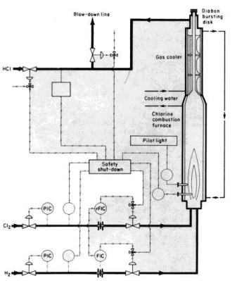 التفاعل بن الهيدروجين والكلور ناشر جدا للحرارة وبتقدم نحو الاكتمال بسرعة حالما يبدأ . ويحتوي مزيج عند التوازن على حوالي 4 % حجما من الكلور الطليق . عندما تبرد الغازات ، يتحد الكلور الطليق والهدروجين الطليق بسرعة حيث يتشكل HCl النقي عند بلوغ درجة الحرارة 200 مئوية .