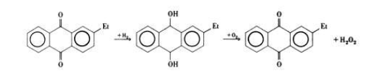 تستخدم جميع المصانع التي تصنع بيروكسيد الهيدروجين والتي بنيت منذ عام 1957 الاكسدة الذاتية للأنثركوينون anthraquinone . يهدرج الكوينون quinone الى هيدروكوينون باستخدام نيكل راني Raney nickle او البلاديوم palladium كماده حفازة . وتنتج الأكسدة التالية بالهواء بيروكسيد الهيدروجين وتعيد توليد الكوينون . ويمكن توضح التفاعلات عن طريق التأكسد السهل لـ 2 - اثيل انثرا كوينون 2-ethylanthraquinone :